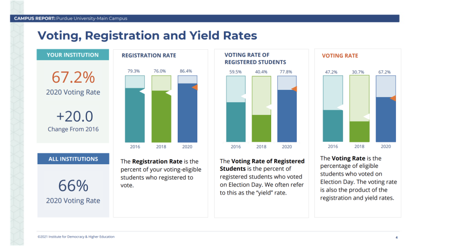 Between 2016 and 2020, the national average in student voter turnout went from 53% to 66%. At IU, turnout rose from 45% to 67%. Purdue voting rates jumped from 47% to 67%, and at Notre Dame voting moved from 53% to 71%.