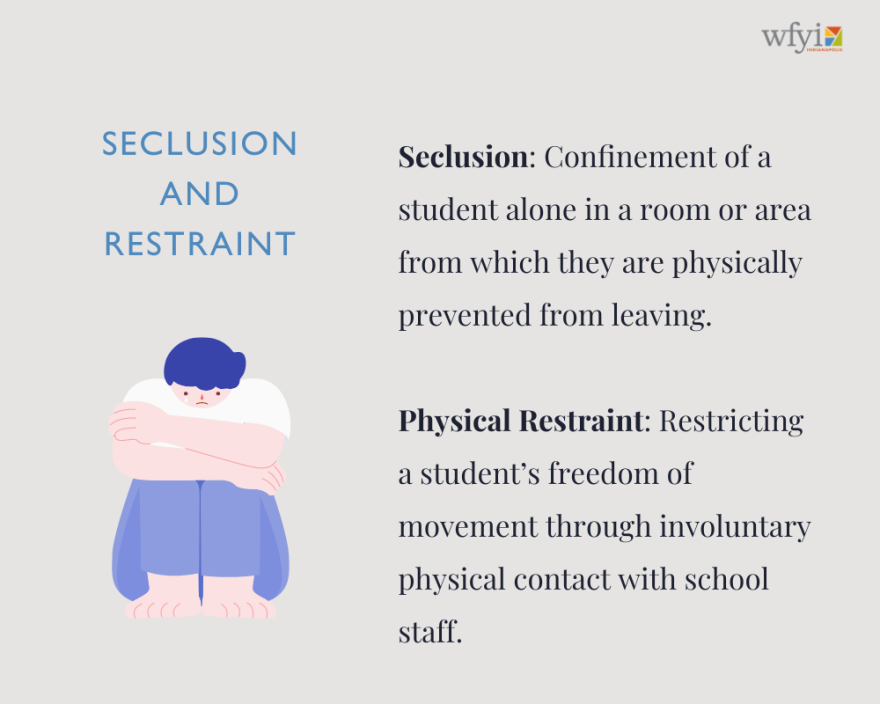 The state defines seclusion as the confinement of a student alone in a room or an area from which they’re physically prevented from leaving. Physical restraint is defined as physical contact between a school employee and student that involves the use of a manual hold to restrict freedom of movement of all or part of a student's body.